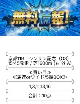 お礼の投稿おそくなりました!先月1月京都重賞シンザン記念が3サンダーストラック・16サウンドムーブ・1アルトラムスの順だったんだけど無料予想でドンピシャ!ワイド・馬連合計3千円が約7万5千になった!