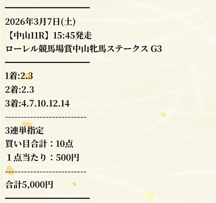 提案通りだと少し怖いので1点100円の10点、合計1,000円分馬券を購入しました。