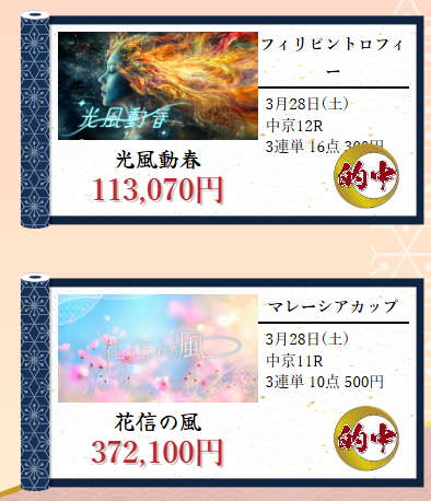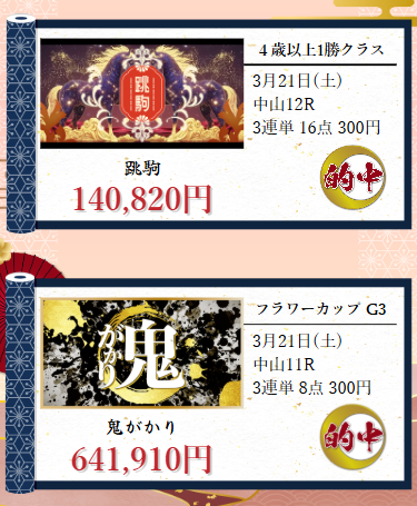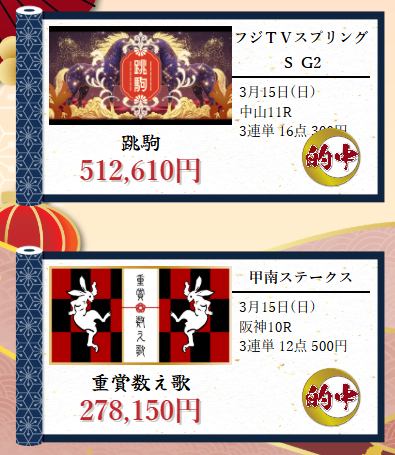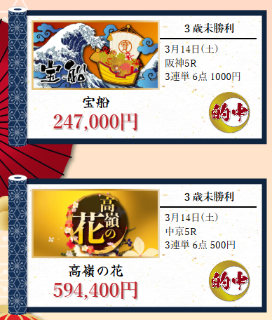 今回重賞・ローレル競馬場記念賞中山牝馬ステークス(G3)で検証しましたが、重賞をしっかり的中!重賞でしっかり結果を出せる上に、毎週土日の中央競馬無料予想や重賞の無料情報はありがたい!