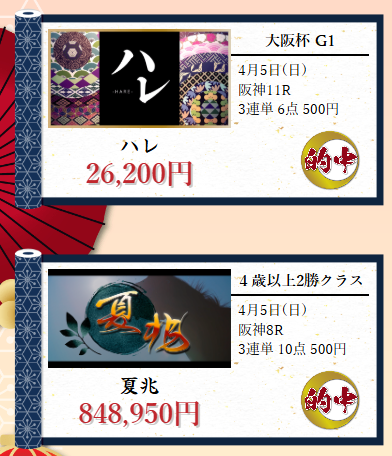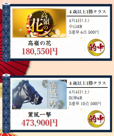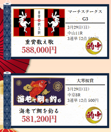 無料情報が意外とバカにならないよね。重賞も対象なのが嬉しい!一応買い目をみてこれはっておもったら買ってる。この前はワイドの2鞍がどっちも的中して数万になったよ。