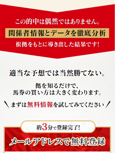 自力で予想を楽しんでいる方も、他の予想サイトを使っている方も、情報は多ければ勝率は格段にUP間違いなし!!簡単に登録でき、即無料予想が受け取れるので勝負前に是非登録してみてください。