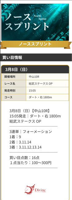 今回ディバインの予想通りに実際に馬券を買ってみましたが、さすがは多数の実績を上げているプロの情報。