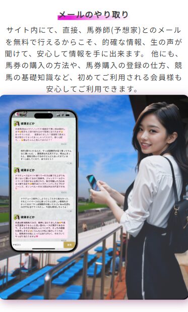 ただ予想を受け取るだけじゃなく、推しの馬券師を見つけて無料でチャットやり取りできるのが大きな魅力です。