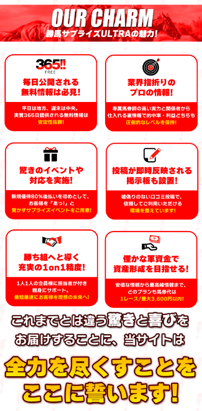 そんな方には、勝馬サプライズ-ULTRA-は一度試してみる価値のあるサイトだと思います。