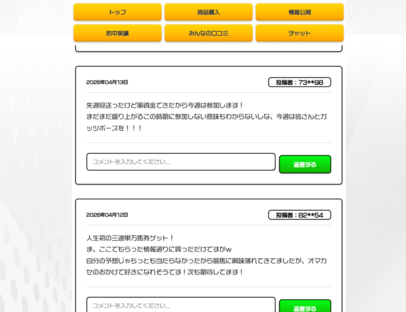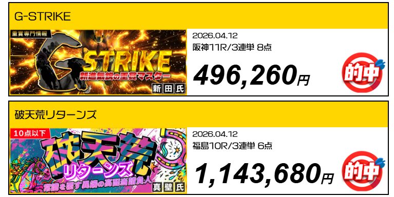 自力で予想を楽しんでいる方も、他の予想サイトを使っている方も、情報は多ければ勝率は格段にUP間違いなし!!簡単に登録でき、即無料予想が受け取れるので勝負前に是非登録してみてください。