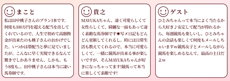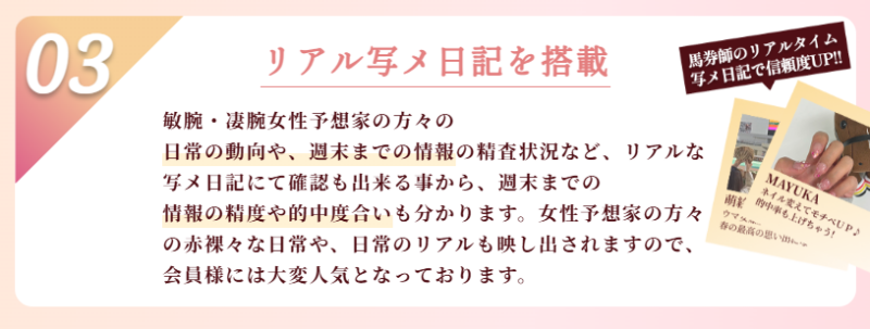 中には写メ日記を公開している予想家もいて、リアルタイムの情報や人柄を知りながら競馬を楽しめます。