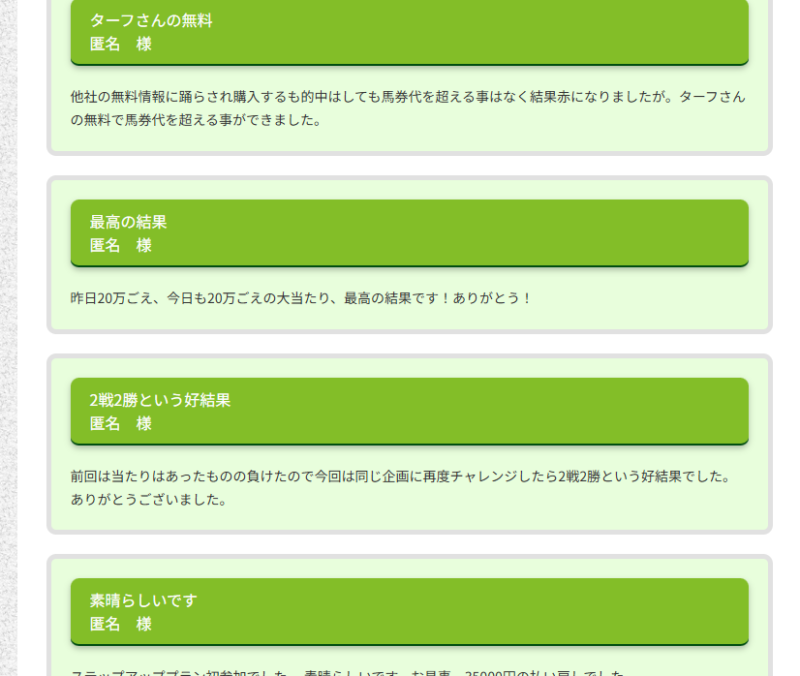 今回紹介した「ターフビジョン」は管理人が検証した結果無料情報の勝率も高いのでまずは無料情報から試して、より稼げる勝率が格段にアップする有料情報に移行するのがおすすめ。