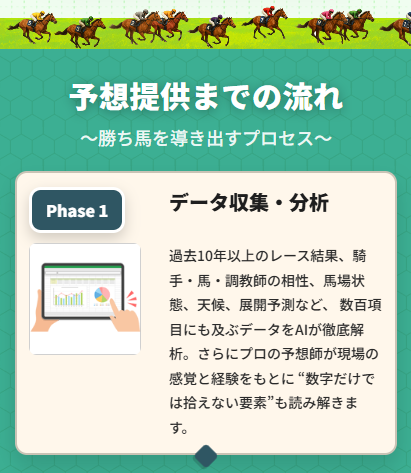過去10年以上のレースデータをもとに、騎手や馬の相性、馬場状態、展開予測など数百項目をAIが解析。